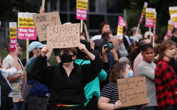 Як пишеBBC, мирні протести відбулися в тих місцях, де планувалися зібрання вороже налаштованих до мігрантів радикалів. Люди тримали у руках плакати з написами “біженців тут вітають”, “більше любові” і “зупиніть ультраправих”.