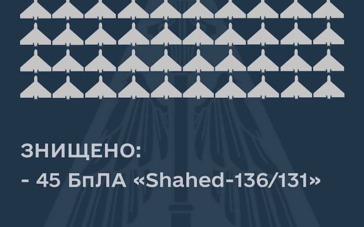 У новорічну ніч російську окупанти атакували Україну безпілотниками-камікадзе іранського виробництва “Shahed-131/136”. Сили оборони знищили 45 апаратів.