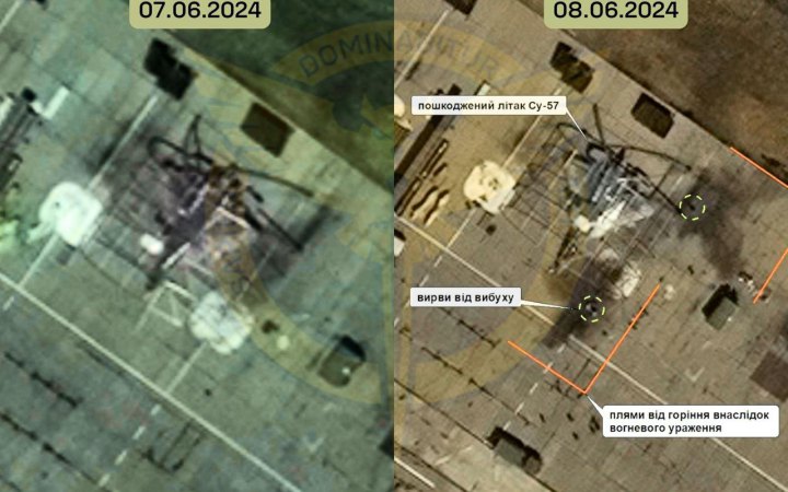 На знімках видно, що сьомого червня Су-57 стоїть цілий, а вже восьмого біля нього зʼявились вирви від вибуху та характерні плями пожежі, що виникла внаслідок вогневого ураження.