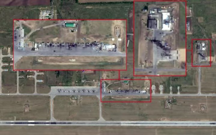 Оприлюднені супутникові знімки вказують на те, що безпілотники вдарили по ангару, всередині якого розміщені борти Су-34.