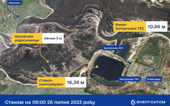 Станом на 08:00 26 липня рівень води у ставку-охолоджувачі Запорізької АЕС без змін. Наразі він становить 16,34 м.