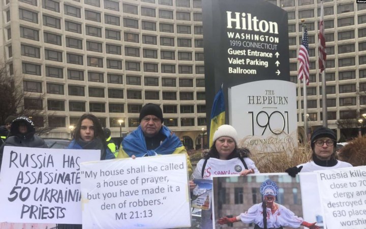 Як пише”Голос Америки”, наші співвітчизники зібралися біля готелю “Гілтон”, де має відбутися саміт Міжнародної релігійної свободи. У руках українські активісти тримали плакати з нагадуванням, що росіяни вбили, за різними даними, від 50 до 70 священників в Україні за час війни, а також знищили понад 630 культових споруд.